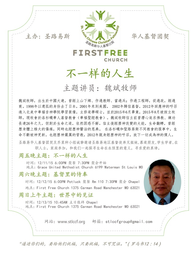 12月这个温馨美丽的月份,是家人好友团聚重逢的时候,两千多年前主耶稣基督在这个月降世为人,更让12月成为最特殊的一月。圣路易华人基督团契及芥菜种小组诚挚邀请圣路易地区基督徒弟兄姐妹,慕道朋友,学生学者,在职人士,家庭参加圣路易斯华人基督团契12月联合聚会,和我们一起探寻生命在永恒里的意义,寻求爱的真谛。